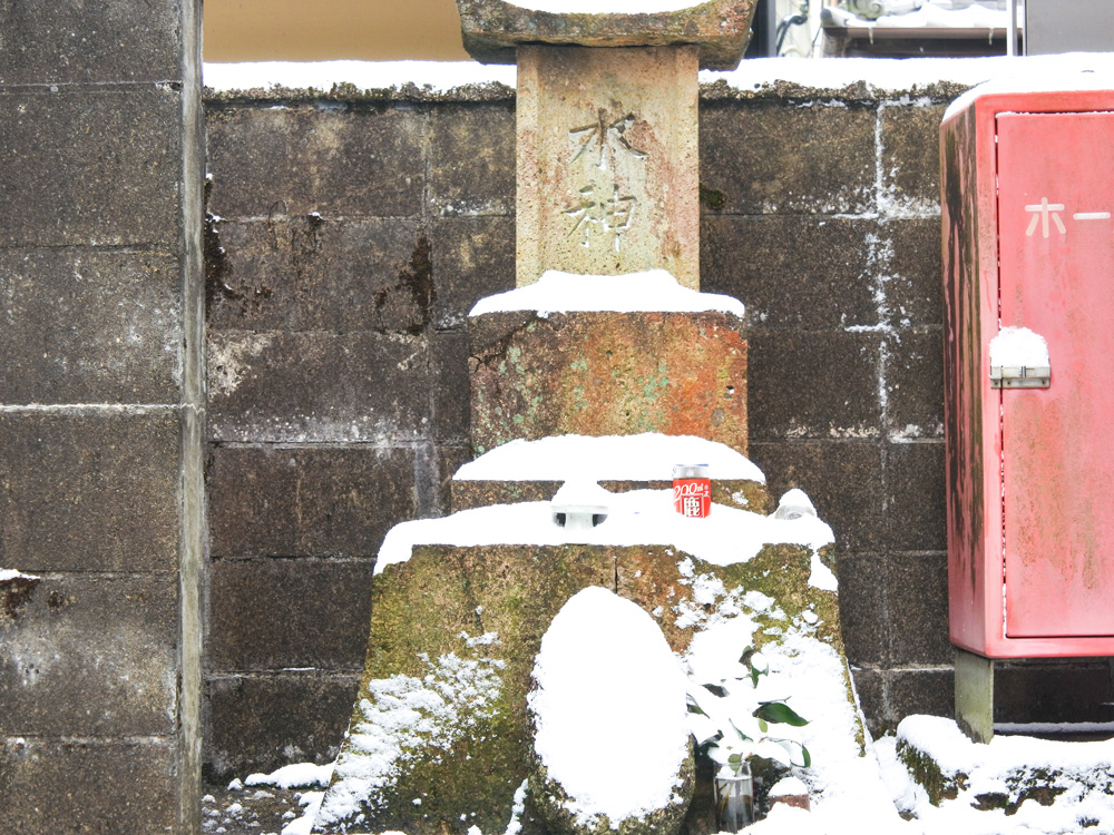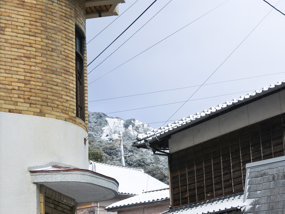 建物の屋根もその隙間から見えるの山の山頂も雪化粧をしていました。